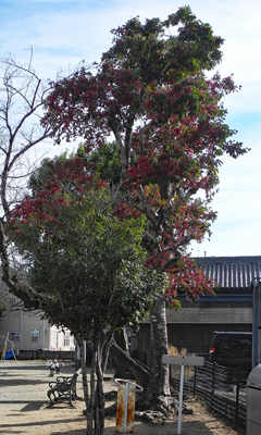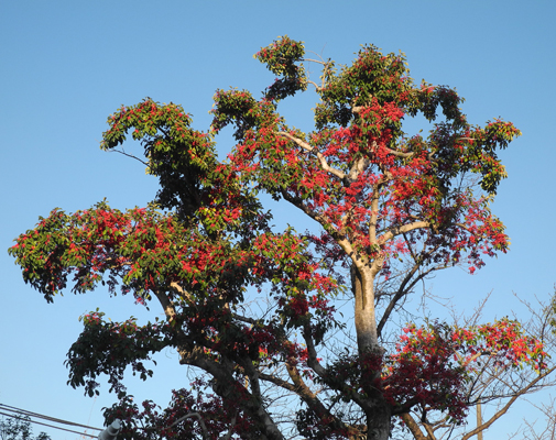 | ピンクの実のようなもの、焦げ茶のもの、右上の葉のこぶはモチの木と同じように虫の仕業(虫えい)で葉が膨らんだものです。中はアブラ虫の棲家。虫こぶや樹皮にはタンニンが含まれているため染料として利用される。街路樹として、また堅い材のため家具や木刀にも利用される。 |