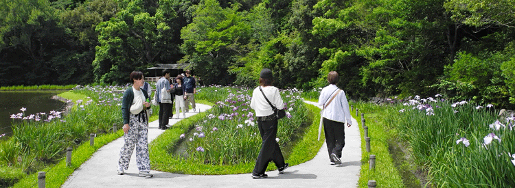 | 2025.05.28 勾玉池の菖蒲が咲き始めました。この時期は東屋に通じる道の門扉が開かれます。遊びに来ている園児さん達が如何にも楽しそうに駆け回っております。普段は訪ねる人も殆ど居なくて怖い位ひっそりしている勾玉池が輝いてます。 |