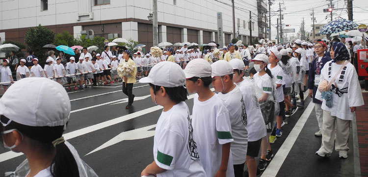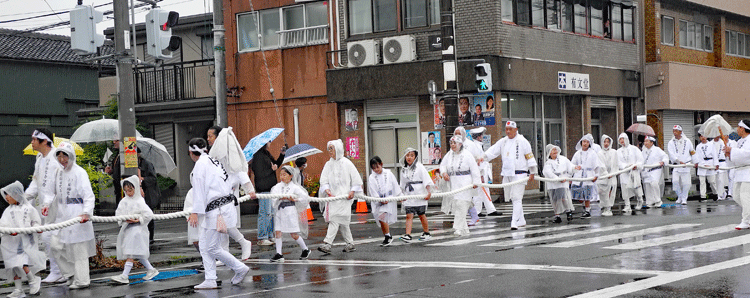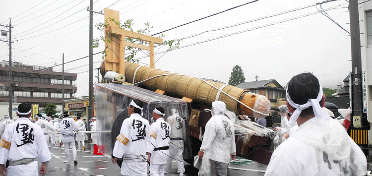 | 2025.06.10 ご神木「御樋代木」陸曳き 度会橋東詰広場についた「ご神木」を載せた奉曳車は雨の中を心地よい椀鳴りを響かせエンヤ、エンヤ、木遣りもうたいエンヤ、エンヤ大勢の子供さんも元気一杯です。途中八日市場ではお茶の接待を受け外宮北御門へもう一息エンヤ、エンヤ、北御門では奉曳車が到着するなり迎える人と曳き手の皆さんが一体になり大きな拍手が涌き上がりました。 |
