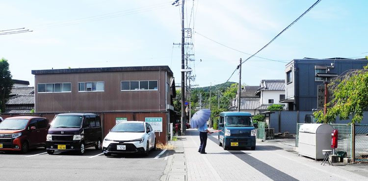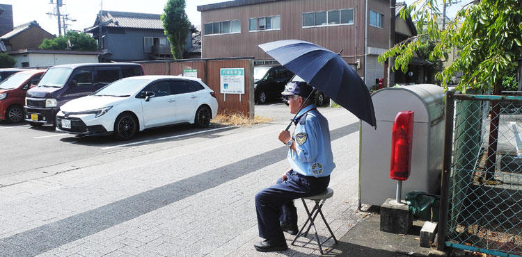 | 2025.08.28 ハローワーク駐車場管理人さんはこの暑さの中でも桜の木、コウモリ傘をうまく利用、居場所確保し、車を誘導される姿は元気いっぱいです。 |