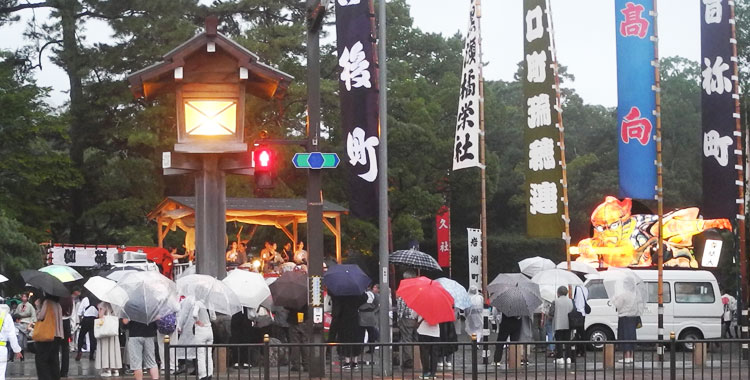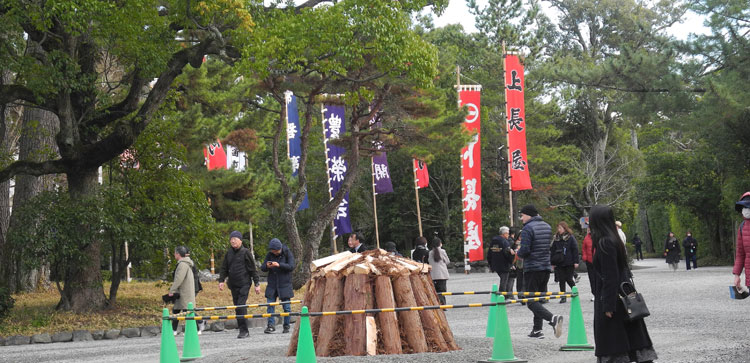 | 2025.06.08 ご神木「御樋代木」 長野県上松町、岐阜県中津川市付知町の御杣山で伐採された「御樋代木」は長野県、岐阜県、愛知県で奉迎され10日度会橋東詰広場に10:40頃到着、そのご神木を載せる為の空車を外宮から提灯で飾りたて度会橋東詰広場に曳きます。 |