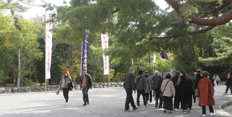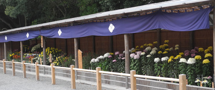 | 2025.11.12 新穀祭の幟の立つ外宮正面広場、火除け橋をわたれば菊花の鉢が並びます。勾玉池にはこの冬の一陣(7羽?)の鴨さん達も。 |
