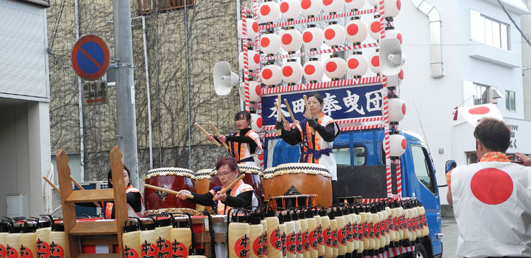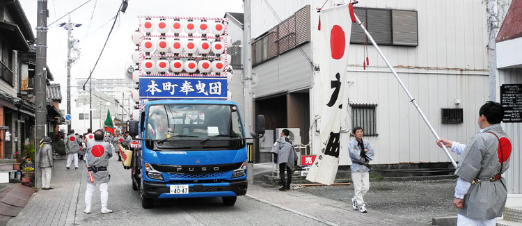 | 2025.12.14 ドーン、ドーンと北御門通りから太鼓の音、何事かと行って見ますと本町の町内曳きでした。日の丸の幟を先頭に お囃子の車、女性の木遣り方も堂に入ったもの。本町の法被は素敵で曳き手の皆さんも声を合わせてエンヤー エンヤー!!。本町ご一家の和やな町内曳きでした。 |
